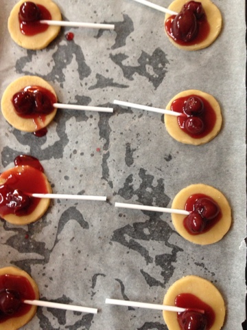 4.Nexr place rounds on the baking sheet and place a stick on each